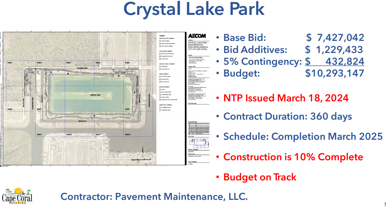 Embers Parkway West (Embers between Old Burnt Store and Burnt Store): Consultant Selected. Access management component completed. Landscape design Phase is ongoing with anticipated completion in September 2024. Median construction Bid in Procurement. Landscape construction expected to begin Q1 of FY25.