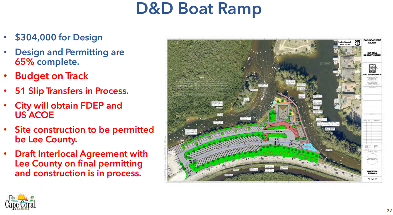 D & D Boat Ramp – Design and permitting are 65% complete.