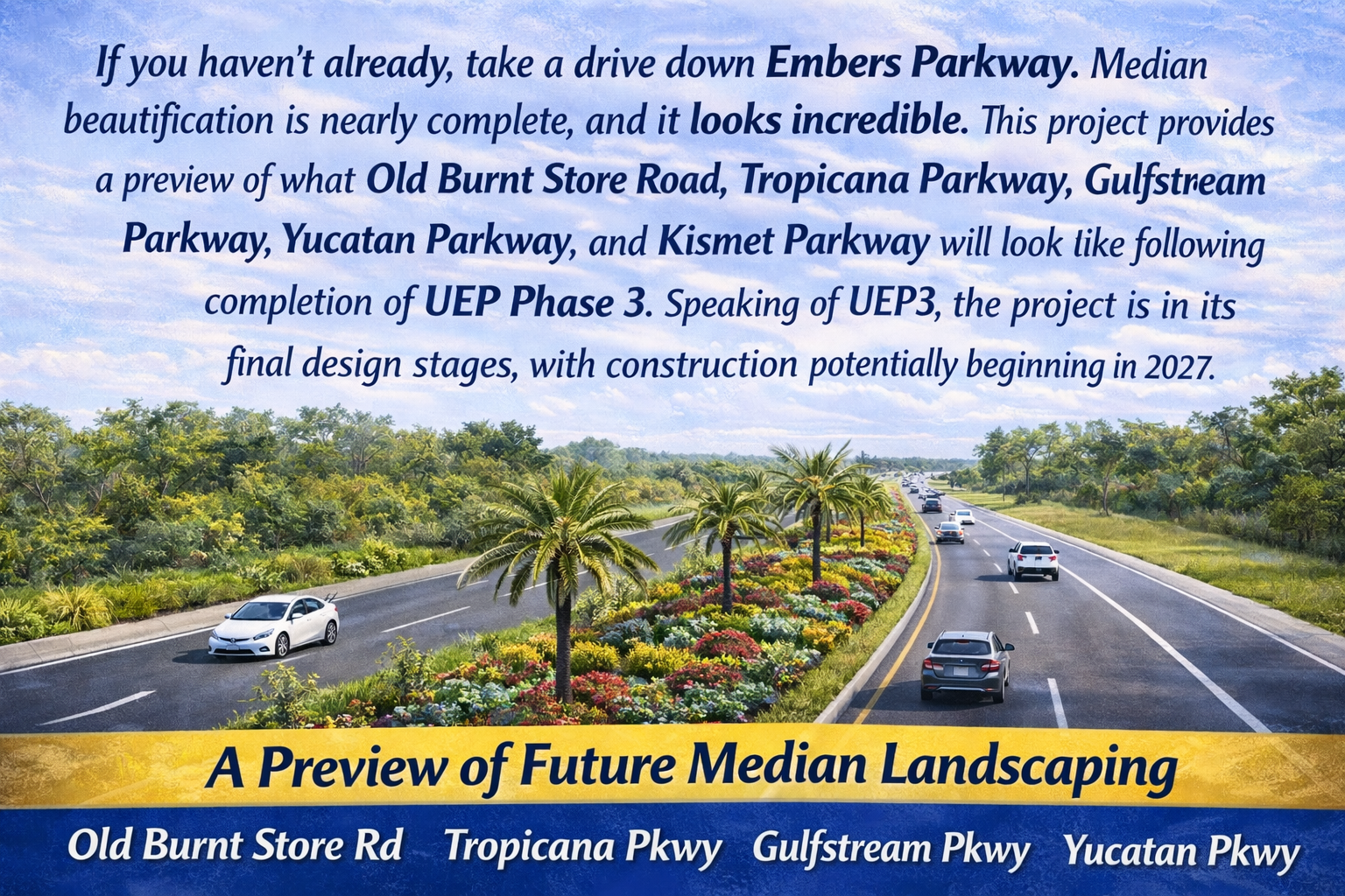 If you haven’t already, take a drive down Embers Parkway. Median beautification is nearly complete, and it looks incredible. This project provides a preview of what Old Burnt Store Road, Tropicana Parkway, Gulfstream Parkway, Yucatan Parkway, and Kismet Parkway will look like following completion of UEP Phase 3. Speaking of UEP3, the project is in its final design stages, with construction potentially beginning in 2027.