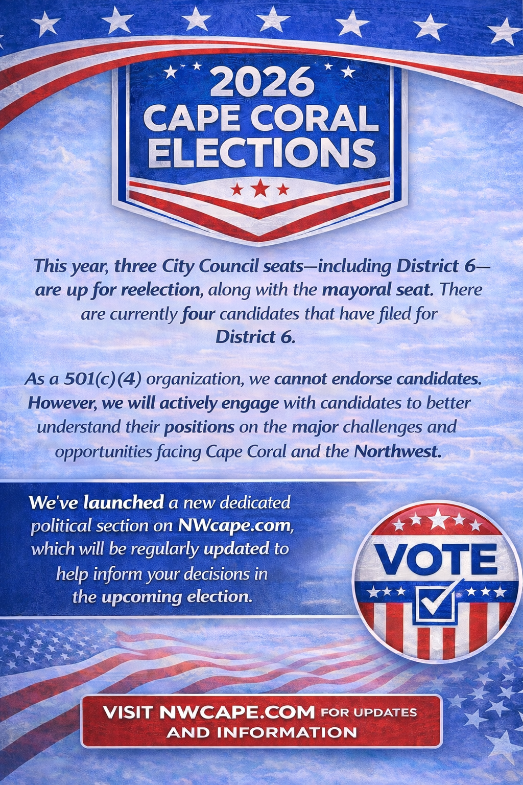 This year, three City Council seats—including District 6—are up for reelection, along with the mayoral seat. There are currently four candidates who have filed for District 6. As a 501(c)(4) organization, we cannot endorse candidates. However, we will actively engage with candidates to better understand their positions on the major challenges and opportunities facing Cape Coral and the Northwest. We’ve launched a new dedicated political section on NWcape.com, which will be regularly updated to help inform your decisions in the upcoming election.