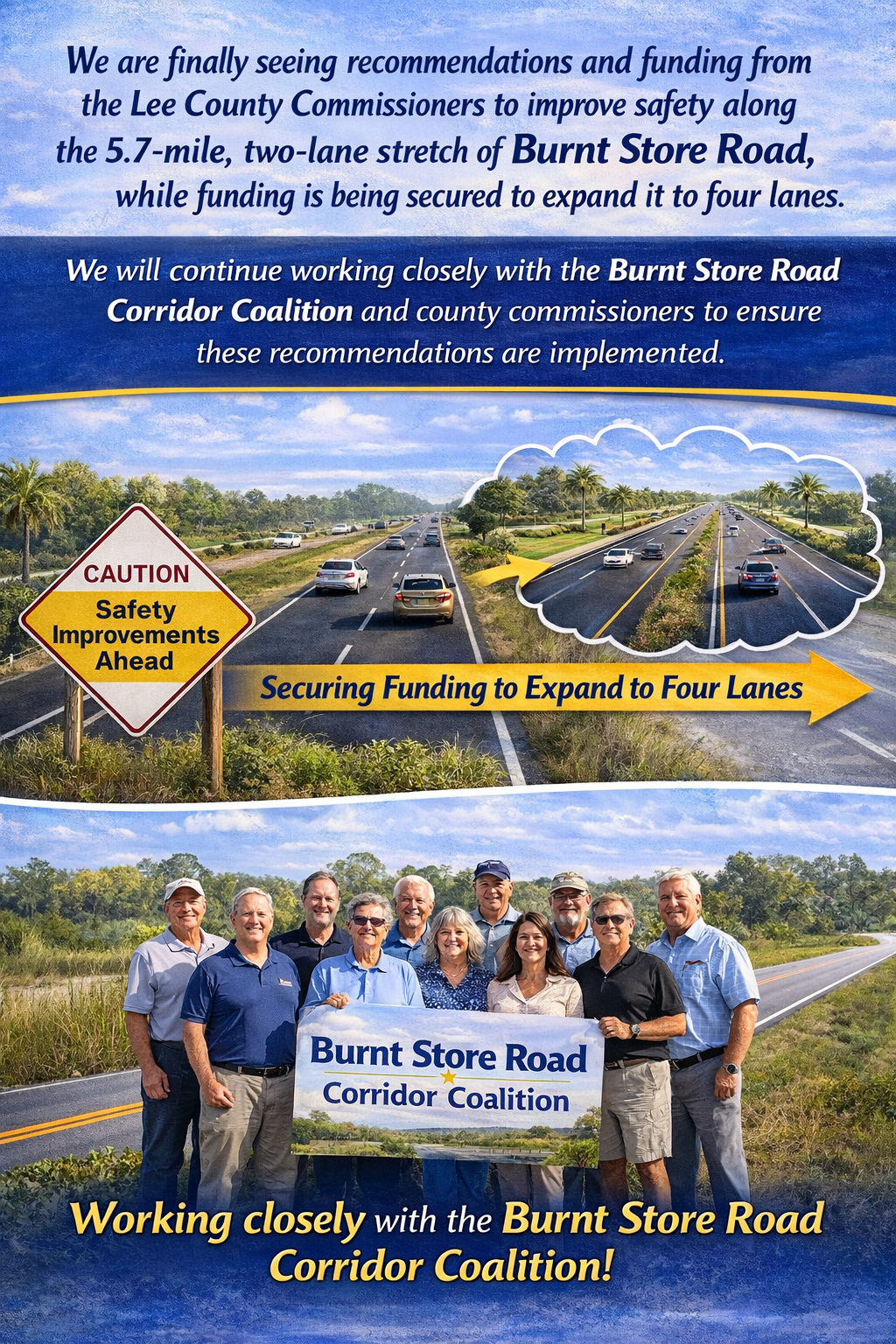 We are finally seeing recommendations and funding from the Lee County Commissioners to improve safety along the 5.7-mile, two-lane stretch of Burnt Store Road, while funding is being secured to expand it to four lanes. We will continue working closely with the Burnt Store Road Corridor Coalition and county commissioners to ensure these recommendations are implemented.