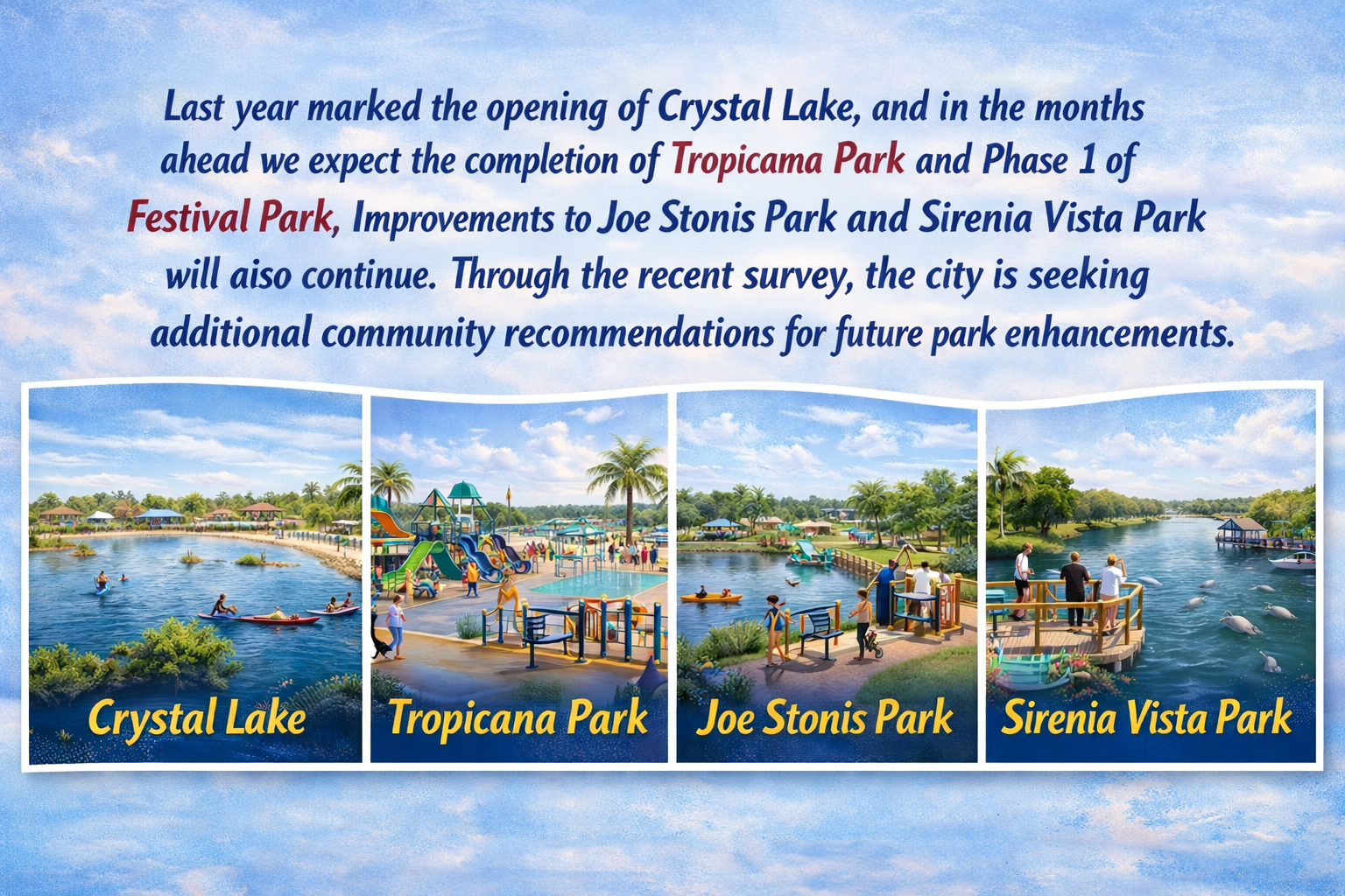 Last year marked the opening of Crystal Lake, and in the months ahead, we expect the completion of Tropicana Park and Phase 1 of Festival Park. Improvements to Joe Stonis Park and Sirenia Vista Park will also continue. Through the recent survey, the city is seeking additional community recommendations for future park enhancements.