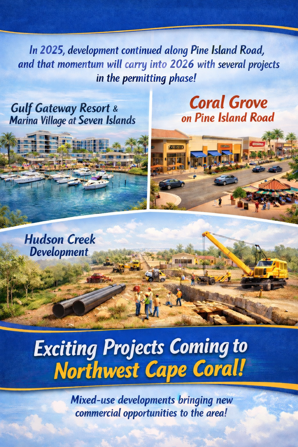 In 2025, development continued along Pine Island Road, and that momentum will carry into 2026, with several projects in the permitting phase. This year will bring progress on three major developments in Northwest Cape Coral. In January, the Council approved the development agreement with Forest Development, allowing the Gulf Gateway Resort and Marina Village at Seven Islands to move forward. Coral Grove on Pine Island Road is scheduled to begin infrastructure installation in the first half of the year, with vertical construction expected in the second half. The Hudson Creek development is also installing infrastructure and will begin connecting to city utilities. All three projects are mixed-use and will bring much-needed commercial opportunities to the Northwest.