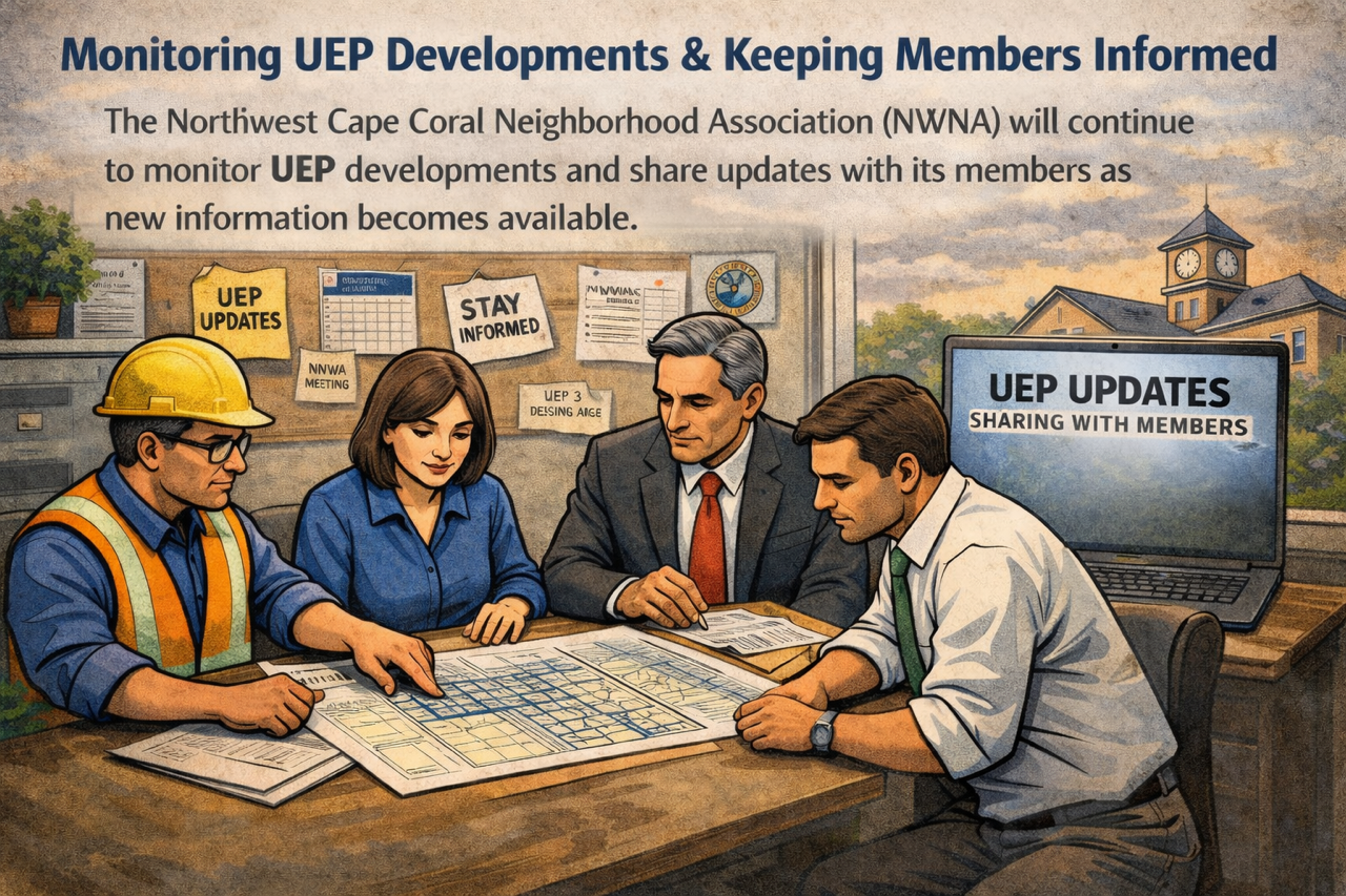 The Northwest Cape Coral Neighborhood Association (NWNA) will continue to monitor UEP developments and share updates with its members as new information becomes available.